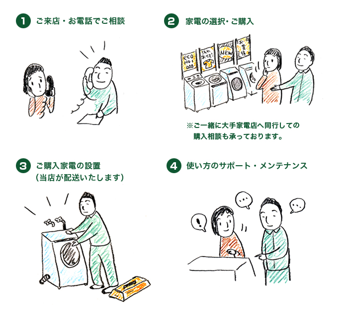 沢山家電があるけど、なにを買っていいかわからない、 どのように使えばいいかわからない、設置ができない。 ご高齢者や家電に不慣れな方にはおすすめのサービスです。 家電の購入のご相談から設置、 メンテナンスまですべてサポートいたします。